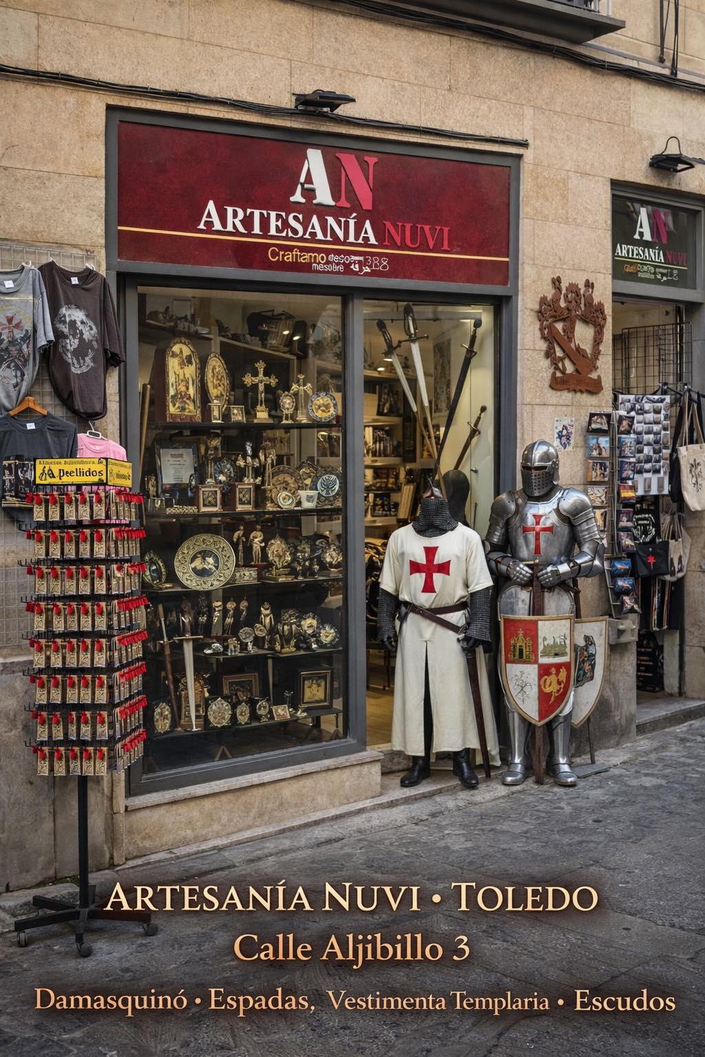 | Incluye | Catálogo de espadas y escudos decorativos, damasquinado, cerámica, figuras templarias, cuadros y souvenirs seleccionados pieza a pieza |