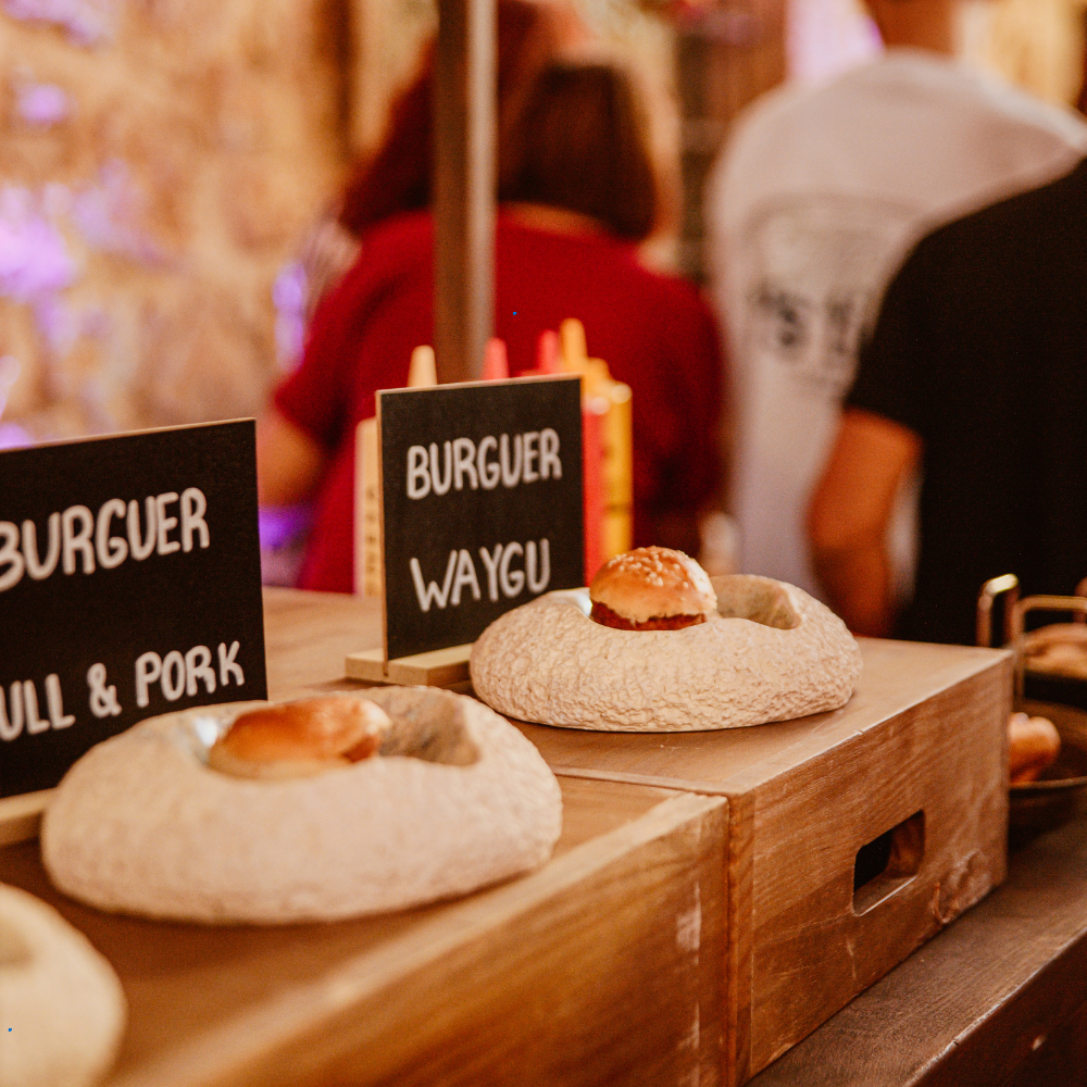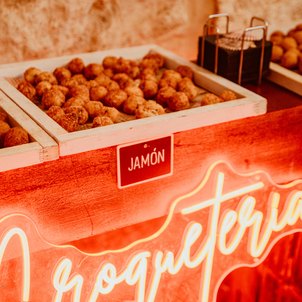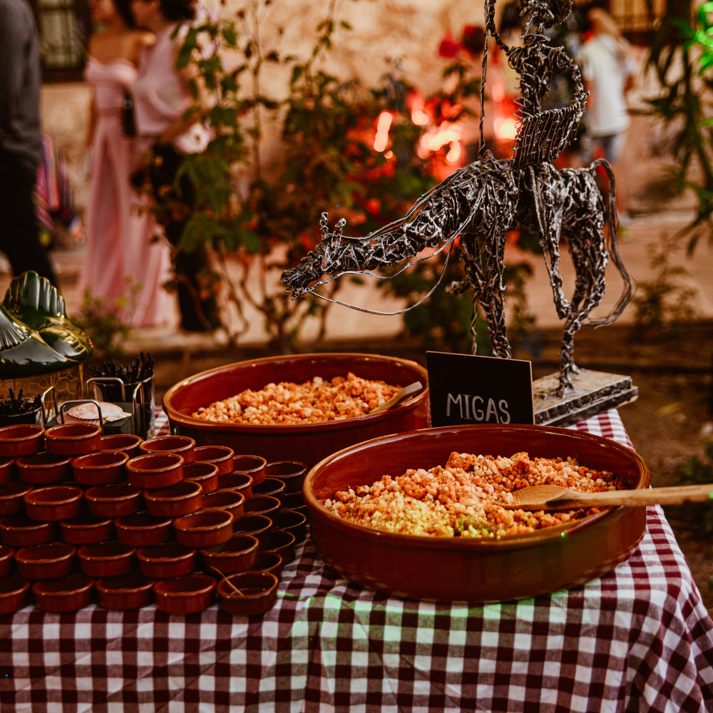 Entre sus formatos están coffee-break, cóctel frío/caliente, vino español, estaciones, running buffet y bandejas variadas.