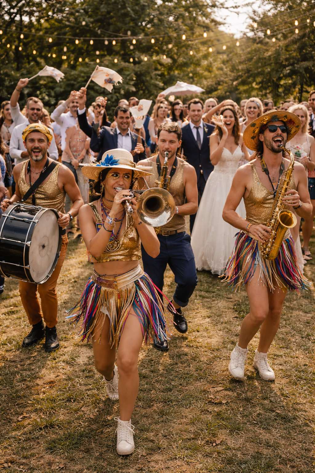 Charanga para bodas y eventos: espectáculo musical ambulante con un toque simpático y divertido para animar fiestas, desfiles y celebraciones. Interpretamos canciones archiconocidas versionadas con el toque orquestero y canallesco de la música ambulante. Formación desde 5 músicos. Duración: a consultar.