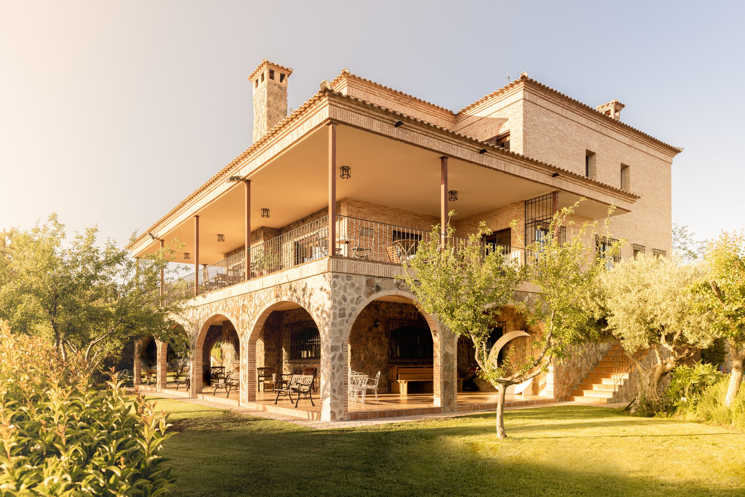 - Terraza y porches cubiertos: porches de ladrillo visto y madera con vistas al jardín, ideales para el cóctel, estaciones gastronómicas o zona chill out nocturna, además de servir como apoyo en caso de lluvia.