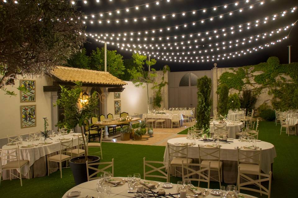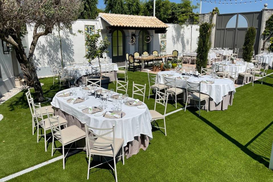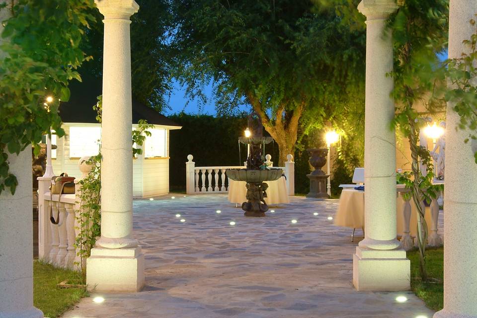 Zonas ajardinadas muy cuidadas, con diferentes rincones para ceremonia civil al aire libre, montaje de altar, alfombra y sillas. Ideales también para el cóctel de bienvenida, estaciones de comida, food trucks, rincones de decoración y reportaje de fotos entre árboles, columnas y fuentes. -