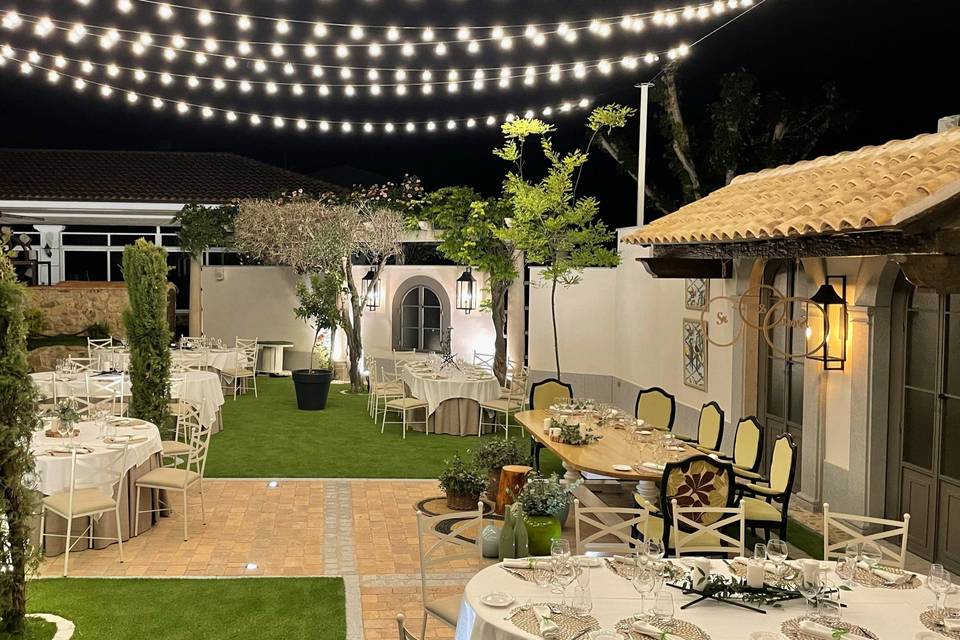 Espacio protagonista en las bodas de primavera y verano, con terraza junto a la piscina donde se pueden organizar cócteles largos o incluso el banquete completo en exterior. Por la noche, la iluminación y las guirnaldas de luz crean un ambiente muy festivo para la barra libre. -