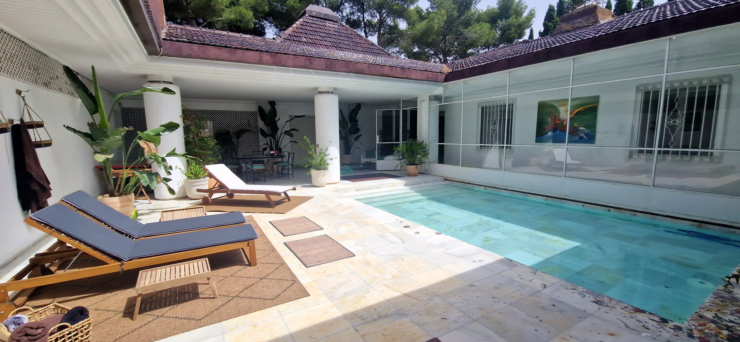 La finca dispone de salones climatizados y zonas interiores polivalentes donde ubicar el banquete, el plan B en caso de lluvia o los momentos más íntimos de la celebración. Los porches cubiertos permiten organizar bufés, estaciones de comida o zonas de copas resguardadas del sol o del frío.