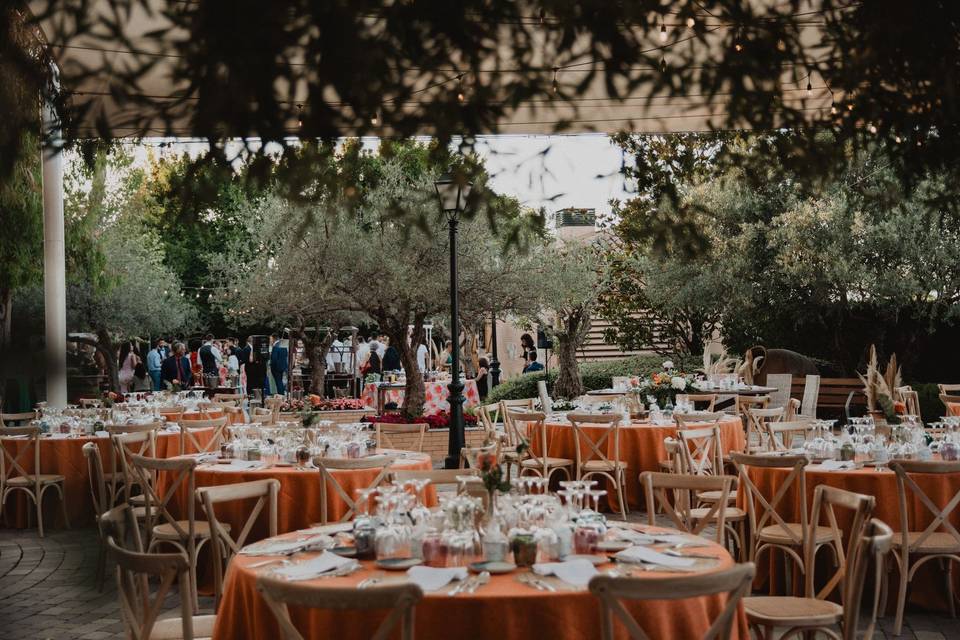 Zonas ajardinadas y adoquinadas con árboles, pérgolas y rincones decorativos donde celebrar la ceremonia civil al aire libre o el cóctel de bienvenida. Son también el escenario perfecto para fotos entre olivos, faroles e iluminación cálida. -