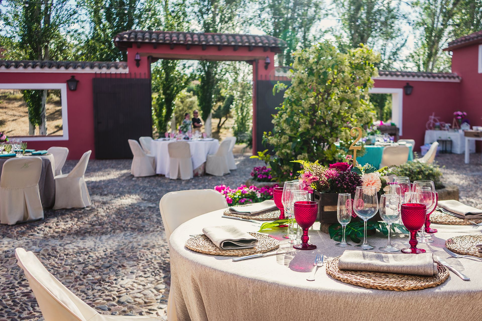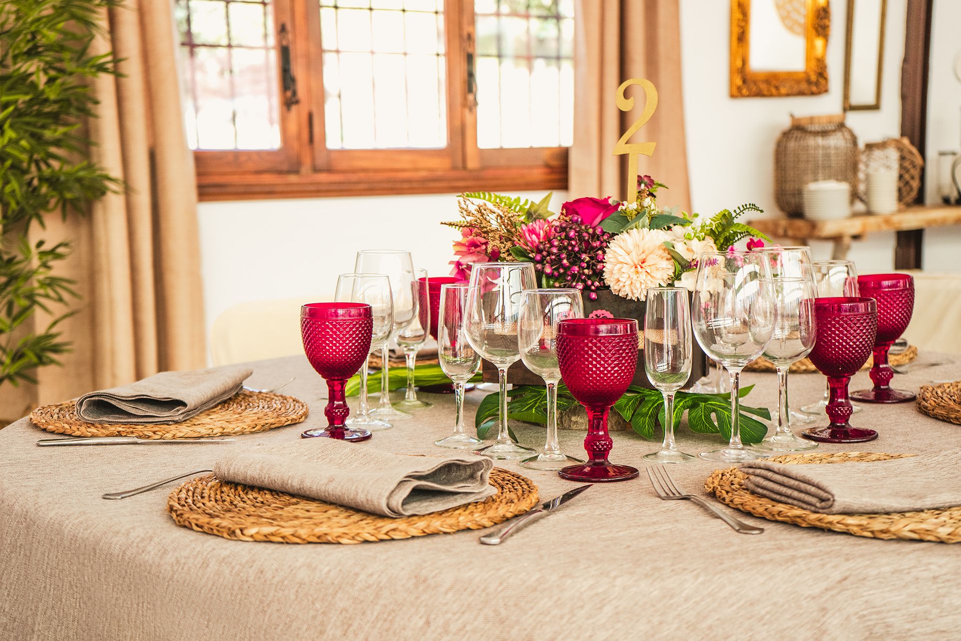 • Uso de vajilla, cristalería y mantelerías de diseño, en línea con el estilo cálido y natural de la finca.