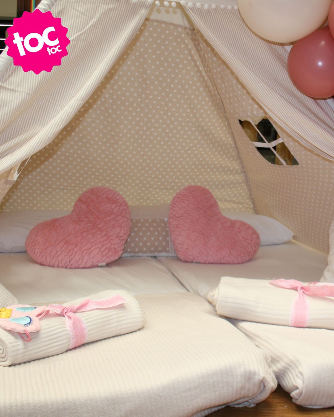 Incluye tipis, decoración, cojines y almohadas y globos. Además, existe la opción de bolsas de chuches.